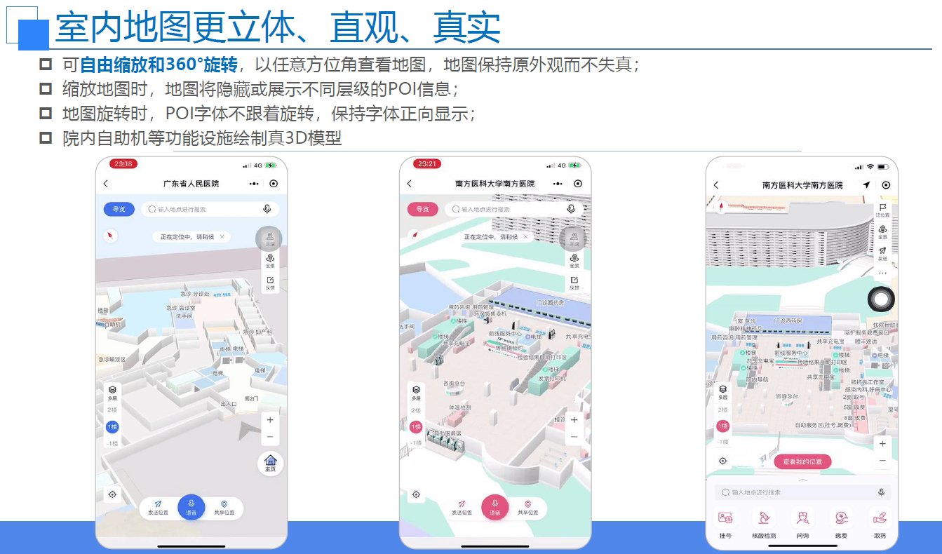 具有精细化的地图导览系统,方便用户了解医院的诊室、缴费处、药房等位置;采用多院融合管理方式,方便患者在一张图上实现花园山院区、光谷院区、凤凰院区、葛店院区间的灵活就诊。
